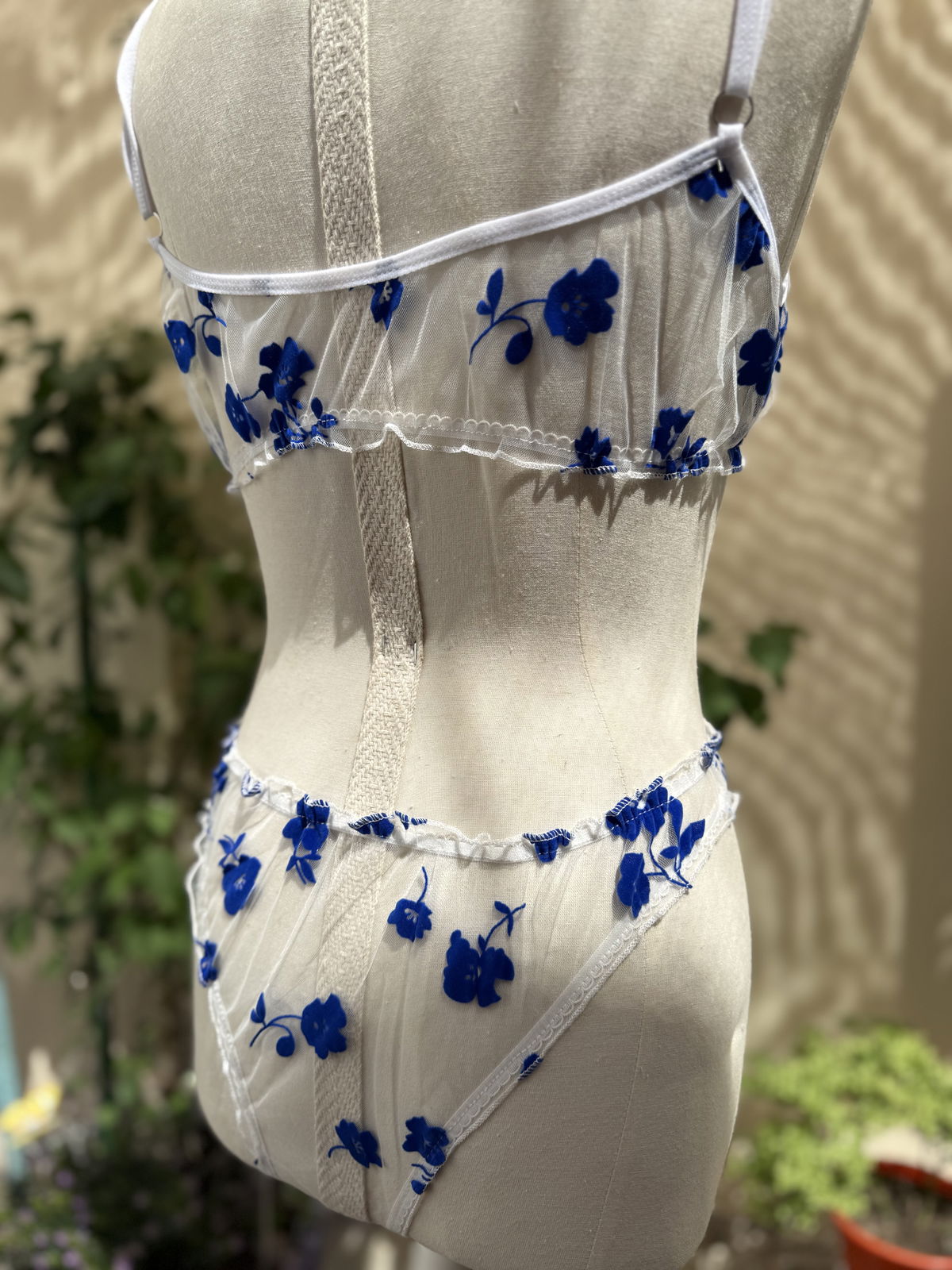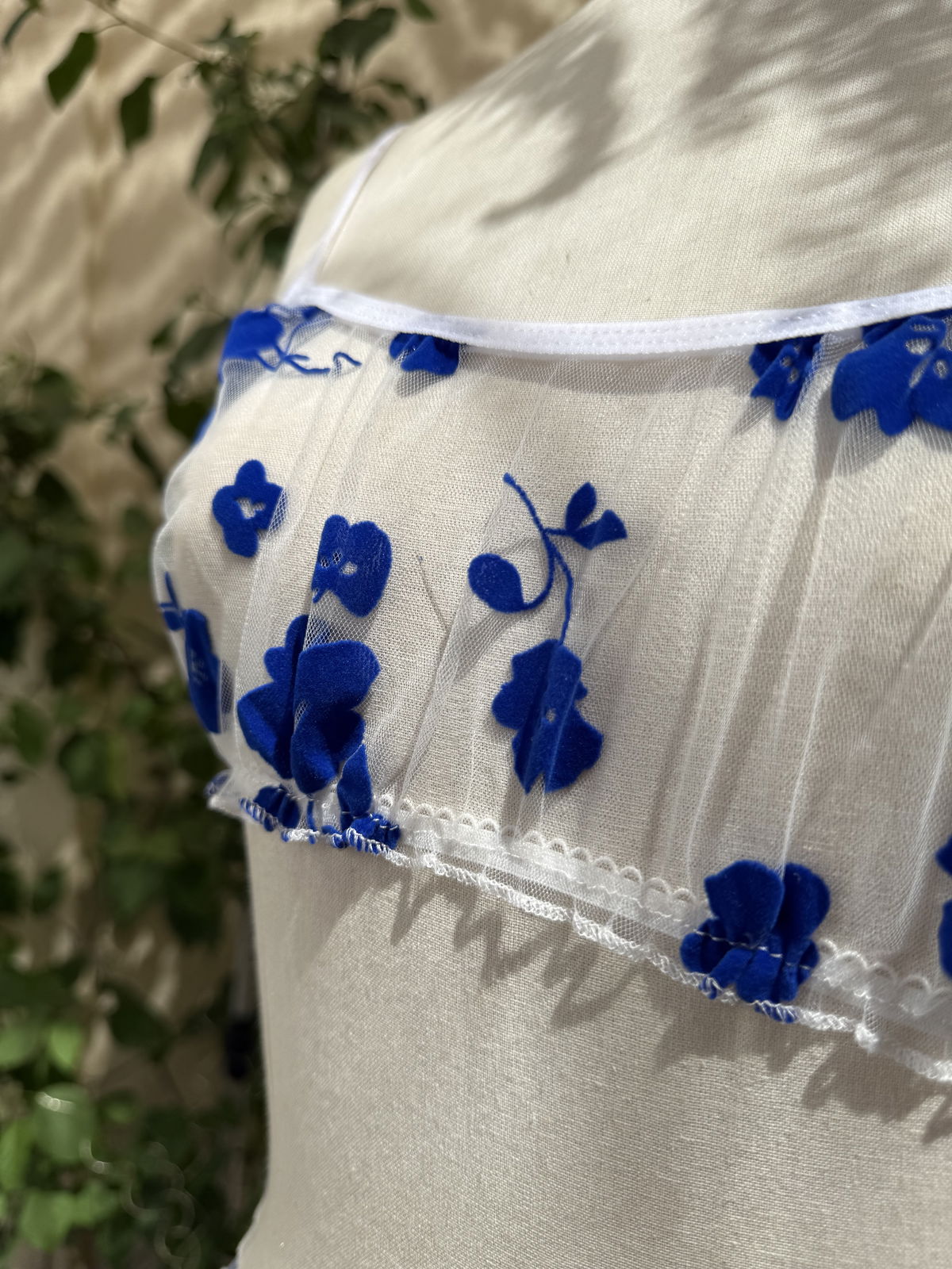 Esta confeccionado en microtul con apliques en terciopelo azul, lo cual hace que sea super elastico. Trae breteles regulables.
