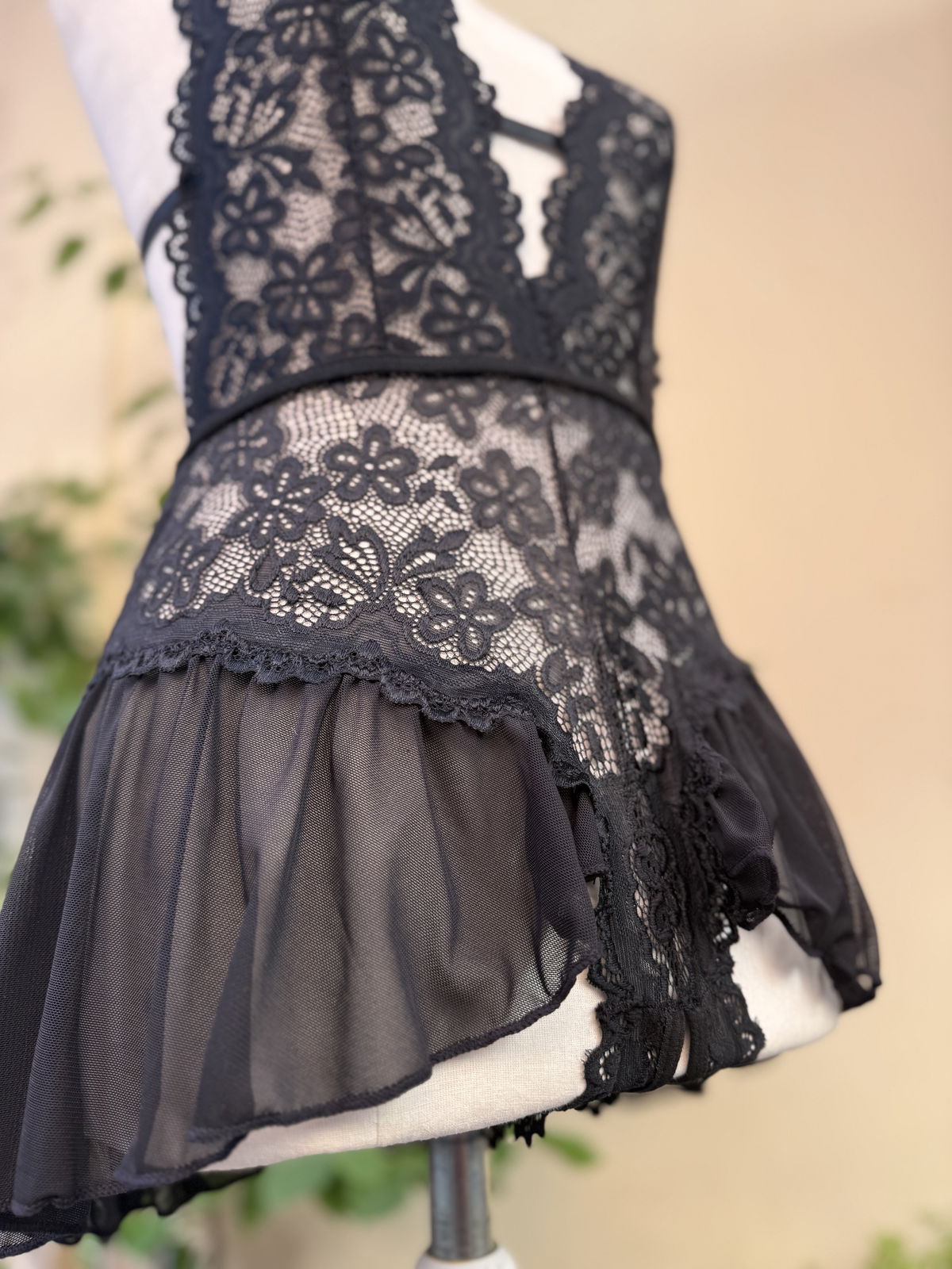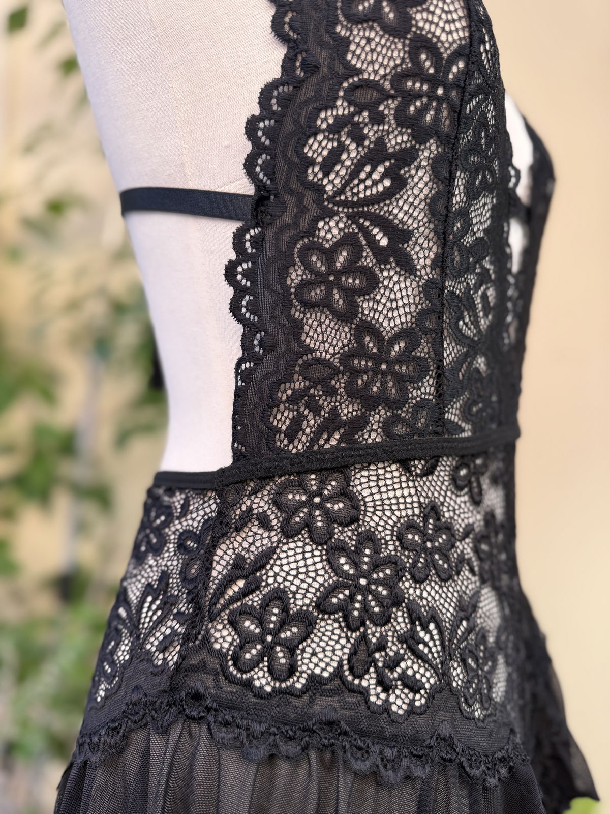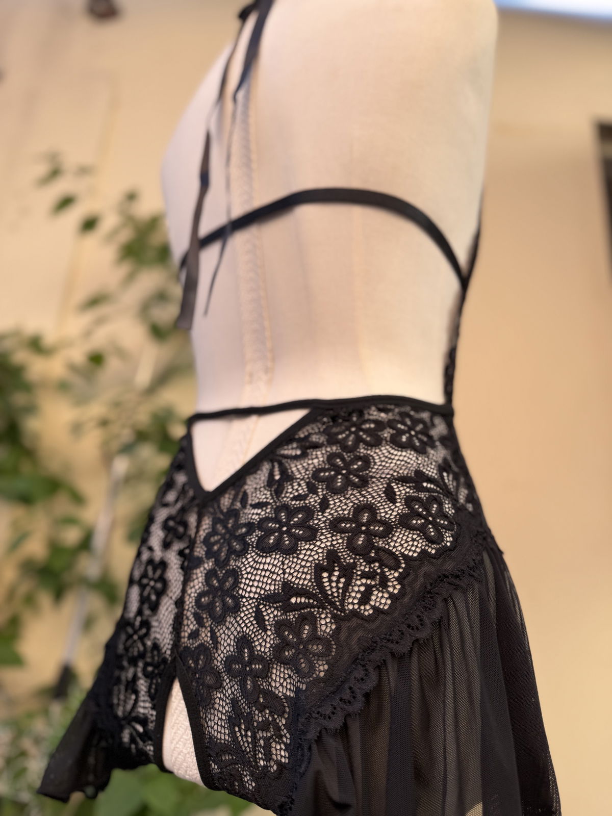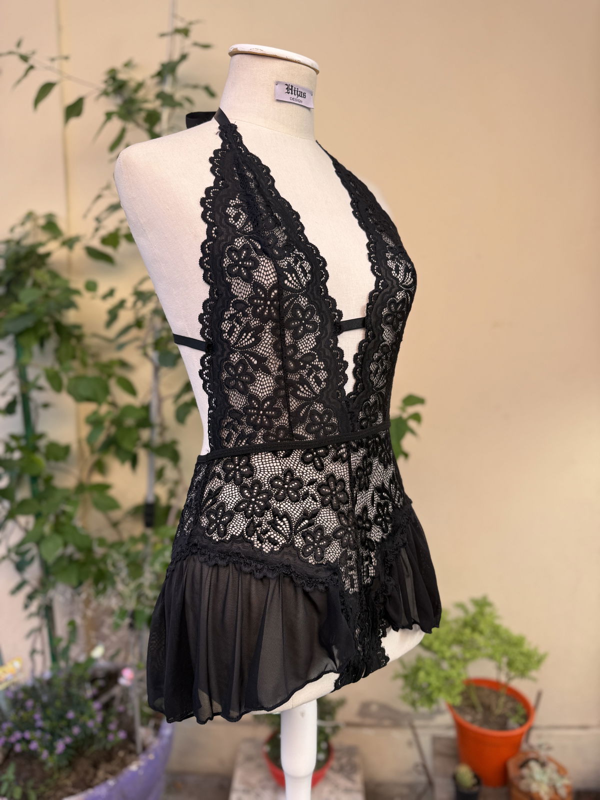 Esta confeccionado con encaje elastizado, lo cual hace que sea super elastico. Trae breteles y cintas regulables.